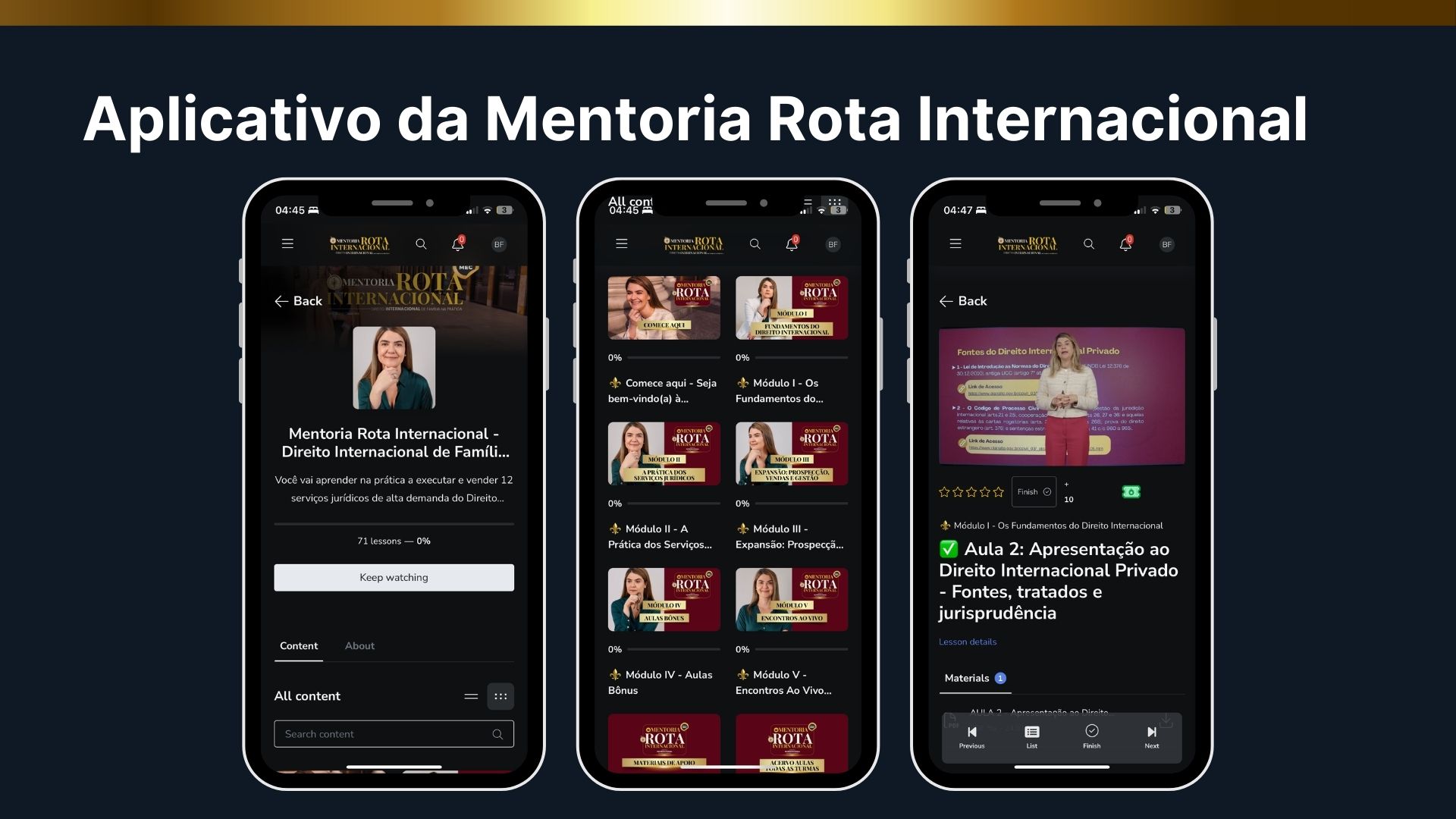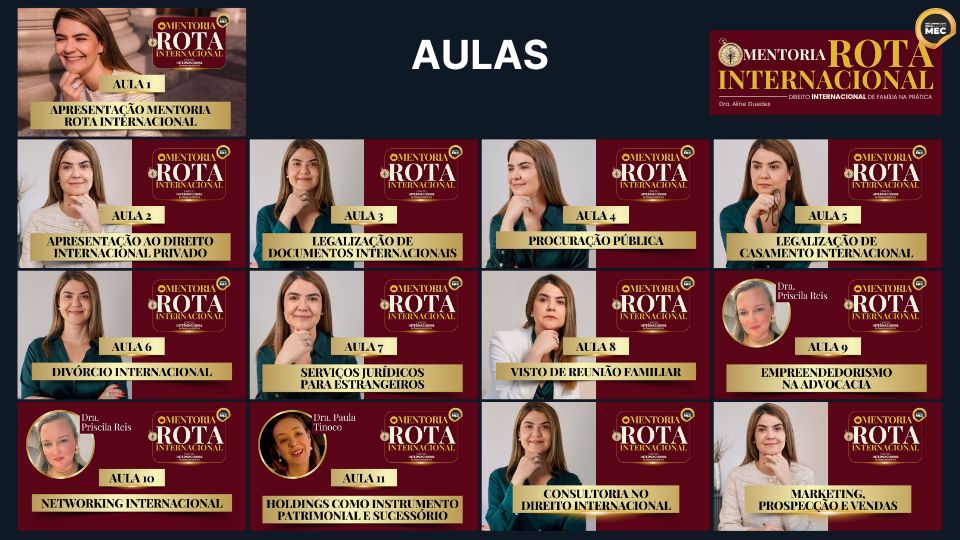 Na Mentoria Rota Internacional você terá acesso ao conteúdo prático, documentos e ferramentas necessárias para atuar na advocacia internacional e construir uma carreira sólida.